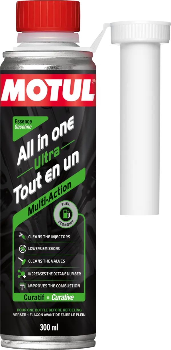 MOTUL® ALL IN ONE ULTRA GASOLINE è un additivo concentrato multifunzionale, curativo e detergente per tutti i tipi di motori benzina, ad iniezione o con carburatore, aspirati o turbo, con o senza catalizzatore o filtro del particolato, funzionanti con benzina con o senza piombo, Etanolo, GPL e biocarburanti.